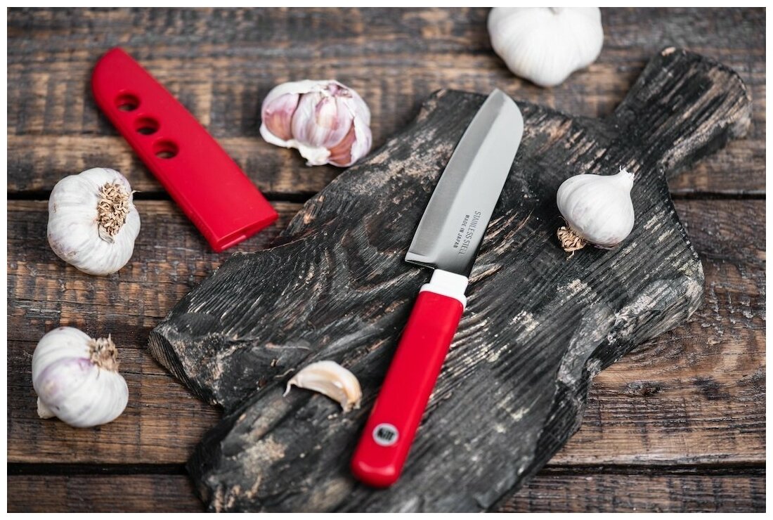 Кухонный нож Tojiro FK Santoku 105 мм (пластиковые ножны, красно-белый)
