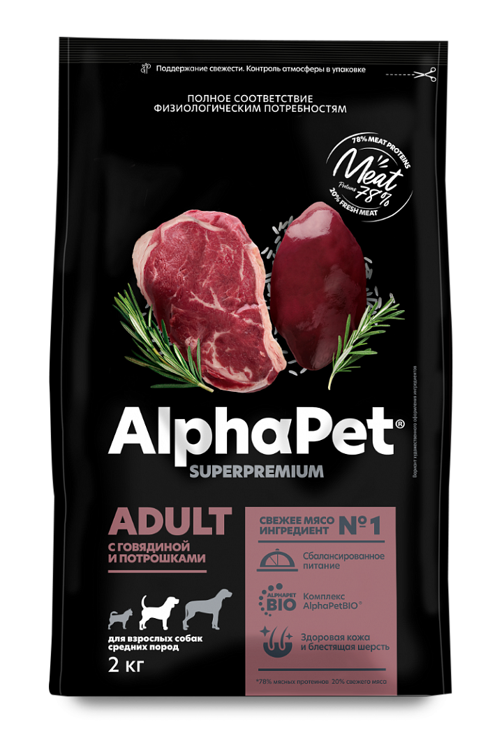 Сухой корм AlphaPet Superpremium (АльфаПет) для взрослых собак средних пород с говядиной и потрошками, 2 кг информация: