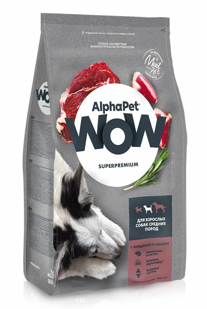 Сухой корм AlphaPet WOW для взрослых собак средних пород с говядиной и сердцем 2 кг 1 123 ₽