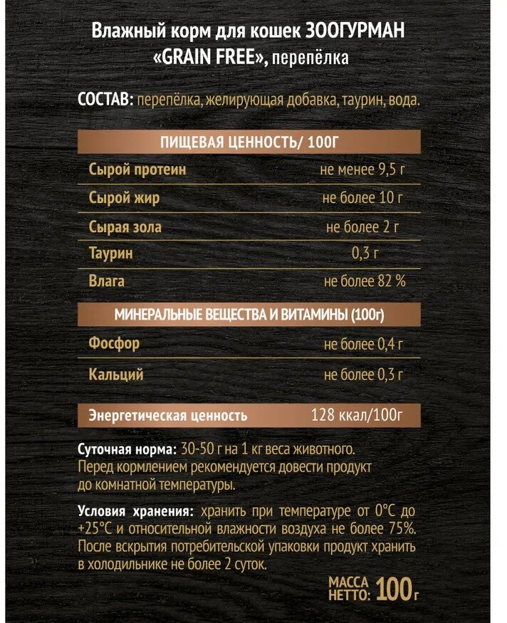 Корм влажный Зоогурман GRAIN FREE, Перепёлка, для кошек 24шт*100г информация: