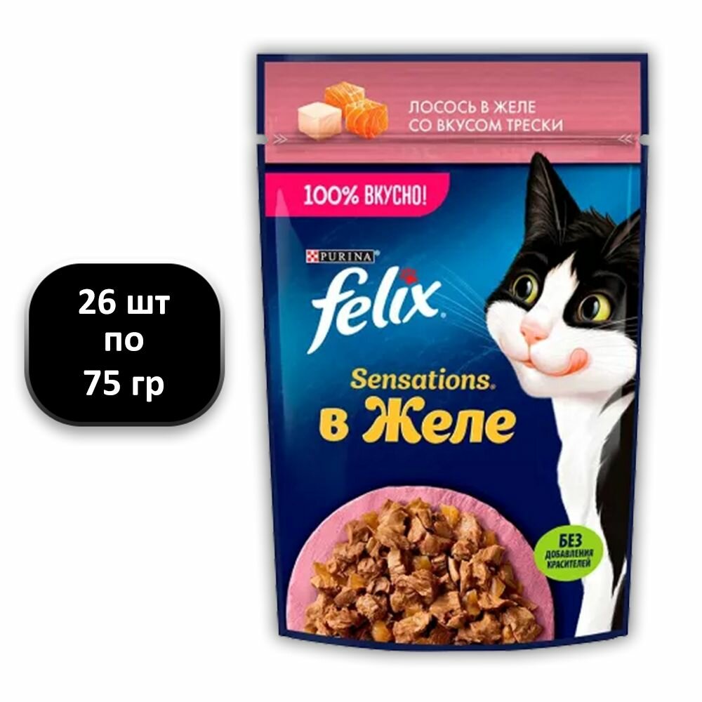 Влажный корм для взрослых кошек Felix Sensations лосось в желе со вкусом трески 26шт.*75г информация: