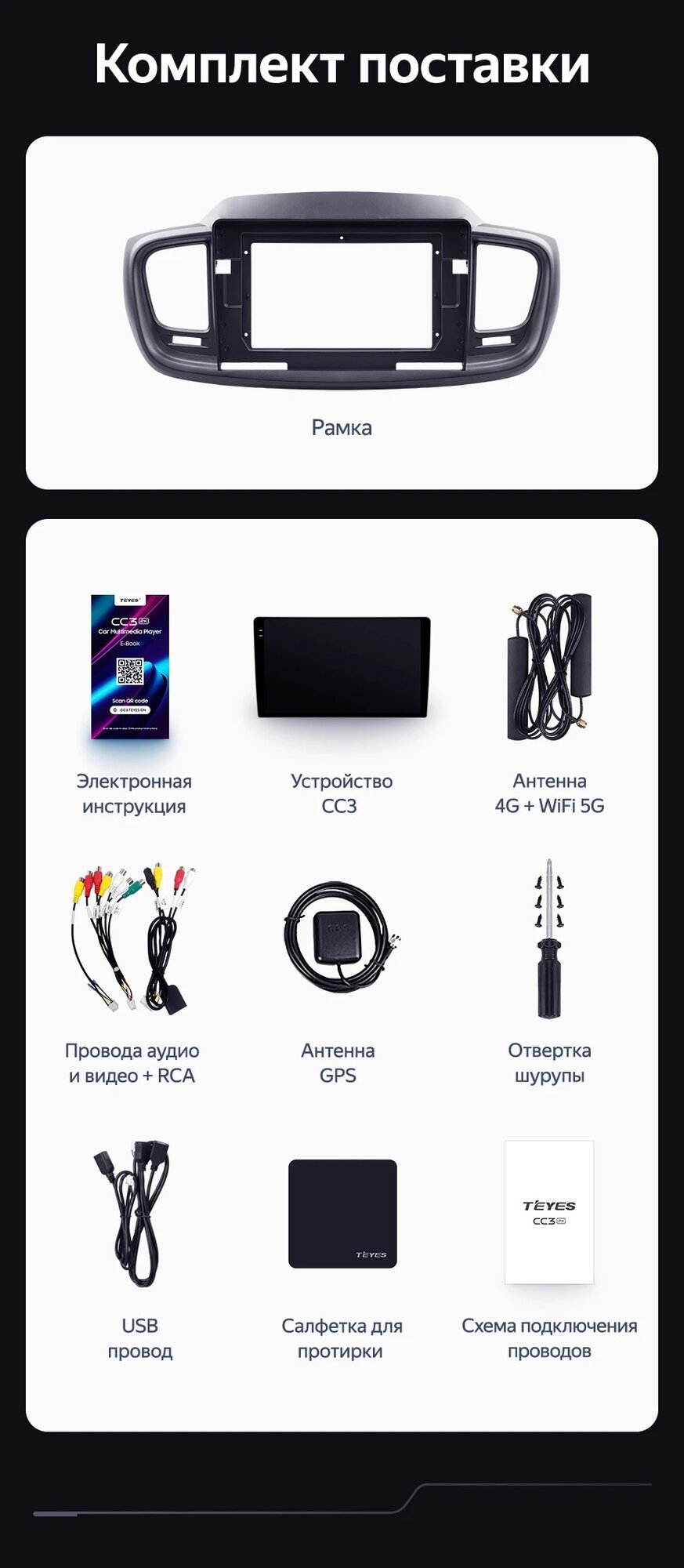 | Дополнительная информация | Головное устройство, Рамка для установки в штатное место, Комплект необходимых проводов, Схема подключения проводов, Антенна GPS+Антенна 4G+Антенна 5G , 3 USB провода, Шурупы и отвертка, Салфетка из микрофибры, Электронная инструкция |