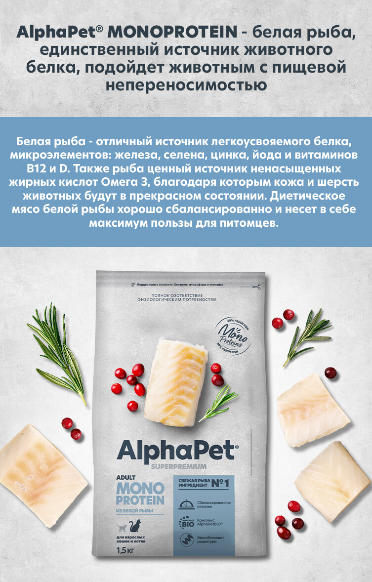 10 цен на ALPHAPET SUPERPREMIUM MONOPROTEIN Сухой полнорационный корм из белой рыбы для взрослых кошек 1,5 кг