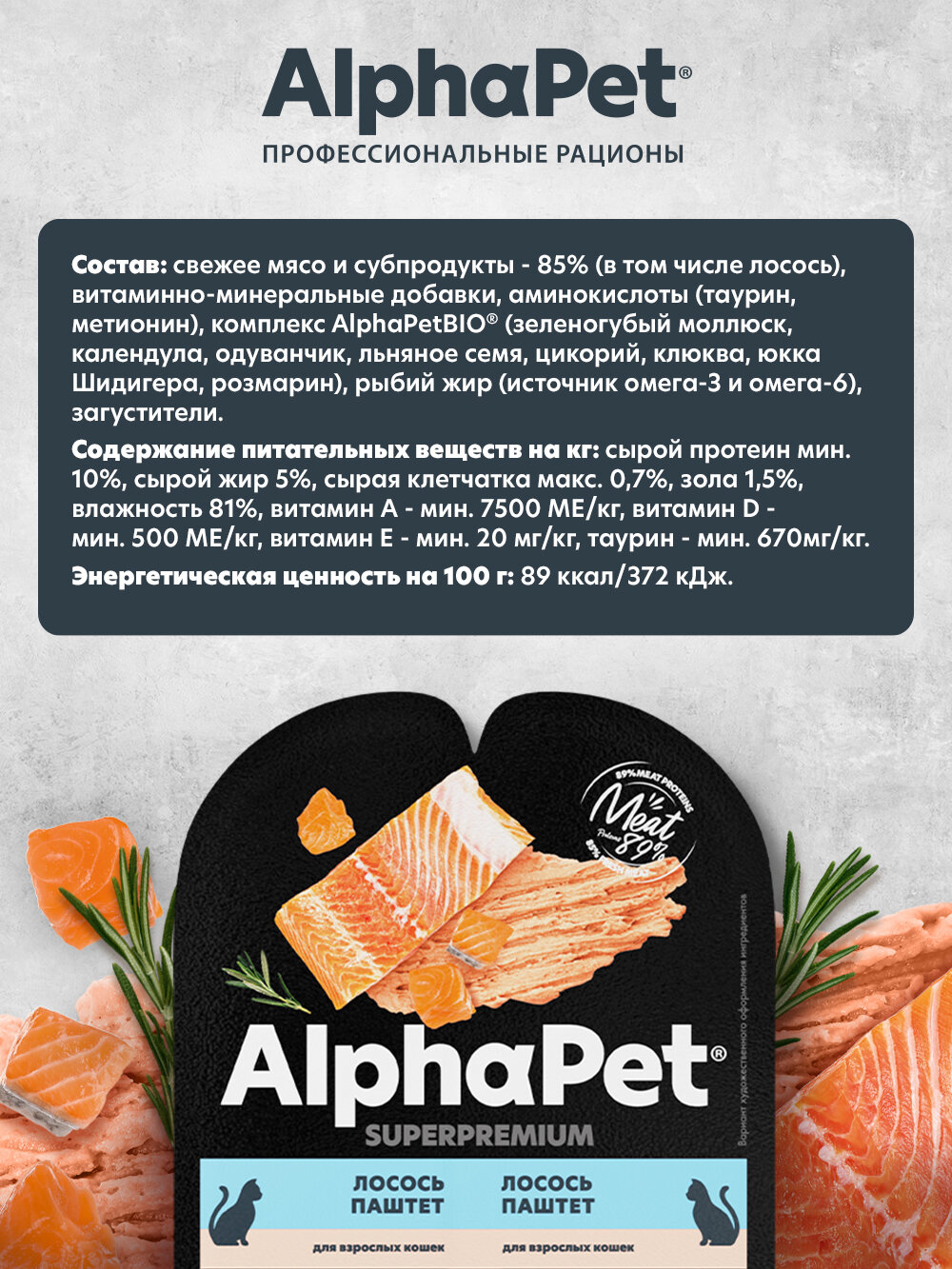 Влажный корм для кошек AlphaPet Superpremium паштет с лососем,упаковка 15 шт х 80 гр информация: