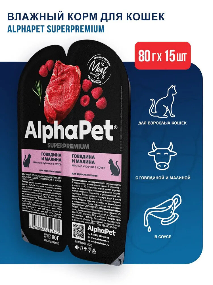 AlphaPet Superpremium влажный корм для взрослых кошек мясные кусочки в соусе, говядина и малина, 80г х 15шт. информация: