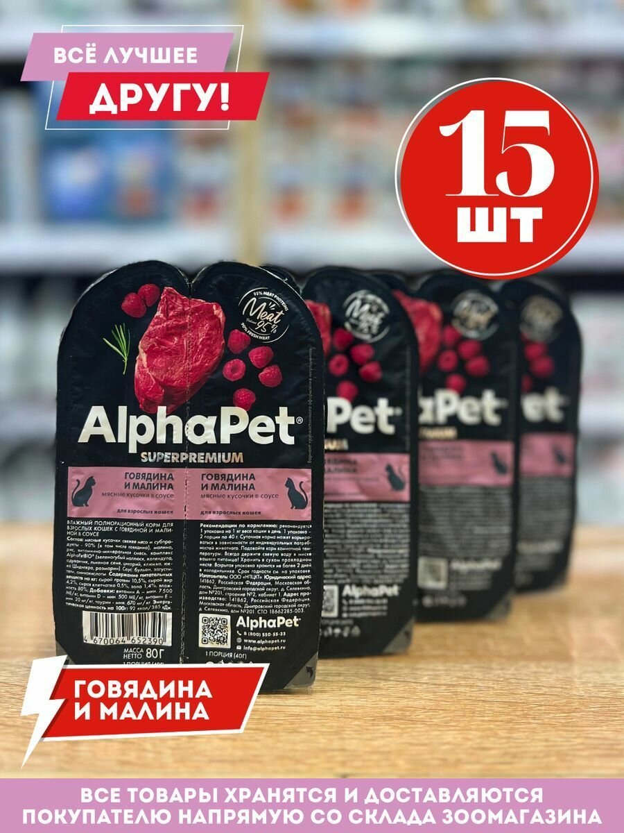 10 цен на AlphaPet Superpremium влажный корм для взрослых кошек мясные кусочки в соусе, говядина и малина, 80г х 15шт.