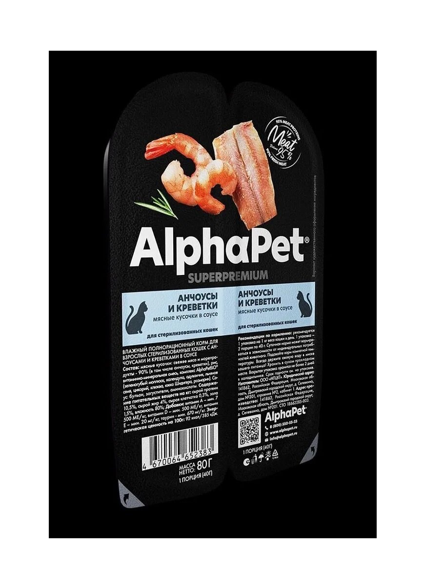 ALPHAPET SUPERPREMIUM 80 гр ламистер влажный корм для стерилизованных кошек анчоусы и креветки 30 шт 3 815 ₽
