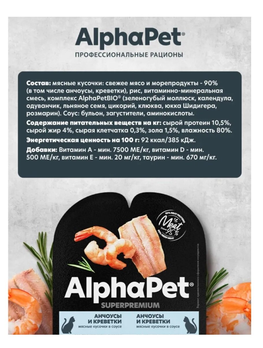 AlphaPet Superpremium пауч для взрослых стерилизованных кошек мясные кусочки в соусе Анчоусы и креветки 80г информация: