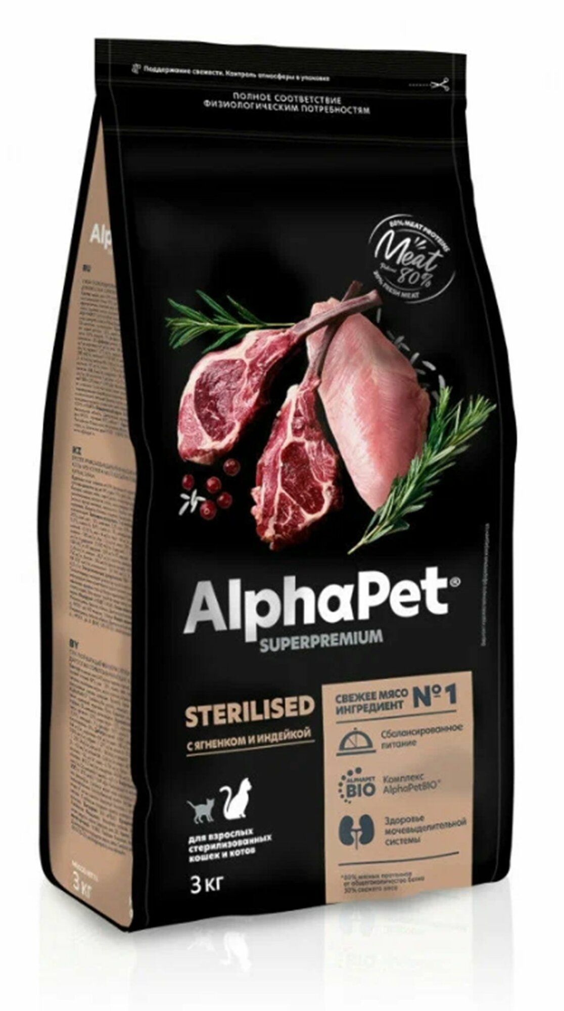 ALPHAPET SUPERPREMIUM STERILISED для взрослых кастрированных котов и стерилизованных кошек с ягненком и индейкой (3 кг)