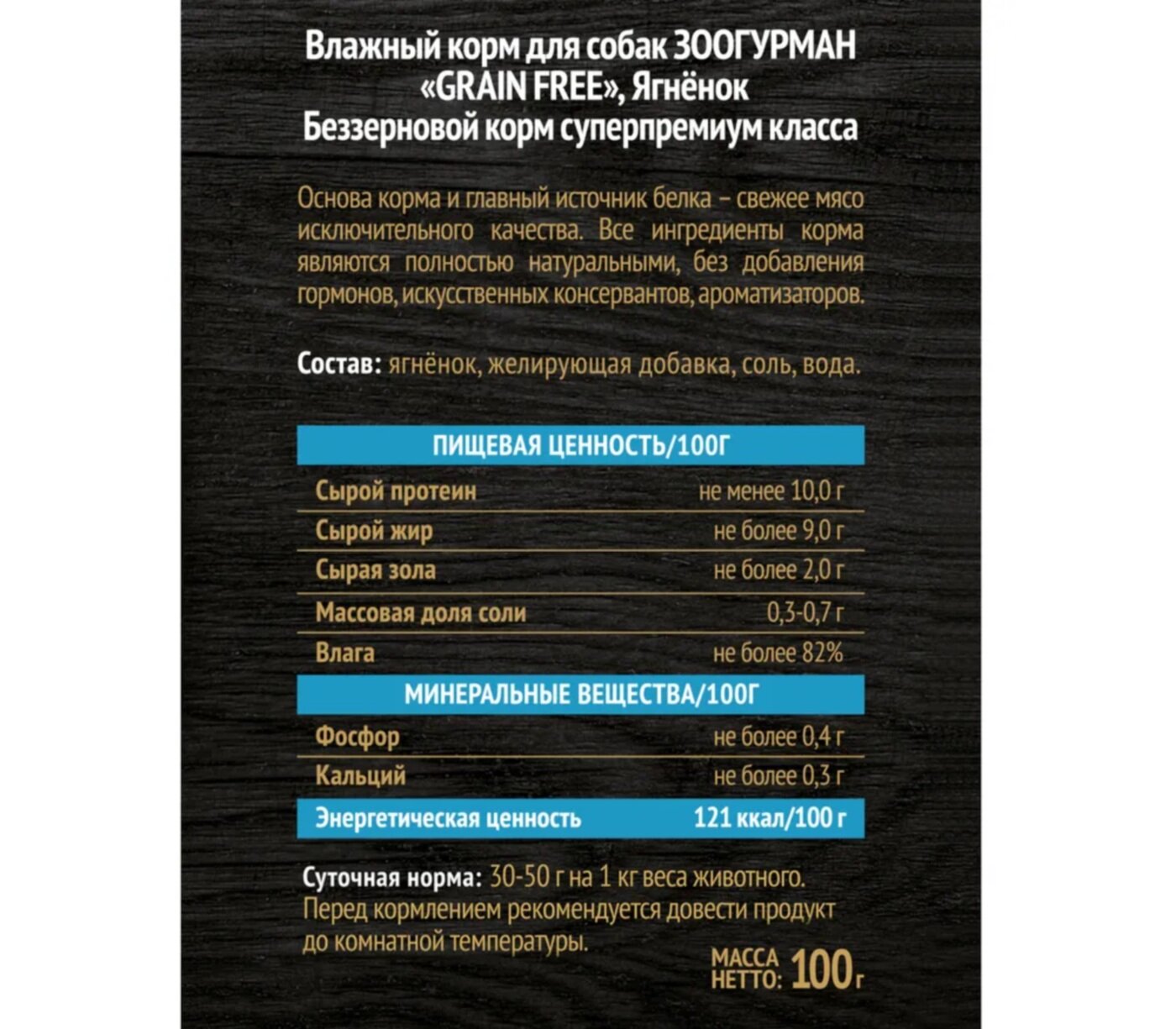 | Состав | ягнёнок, желирующая добавка, соль, вода |