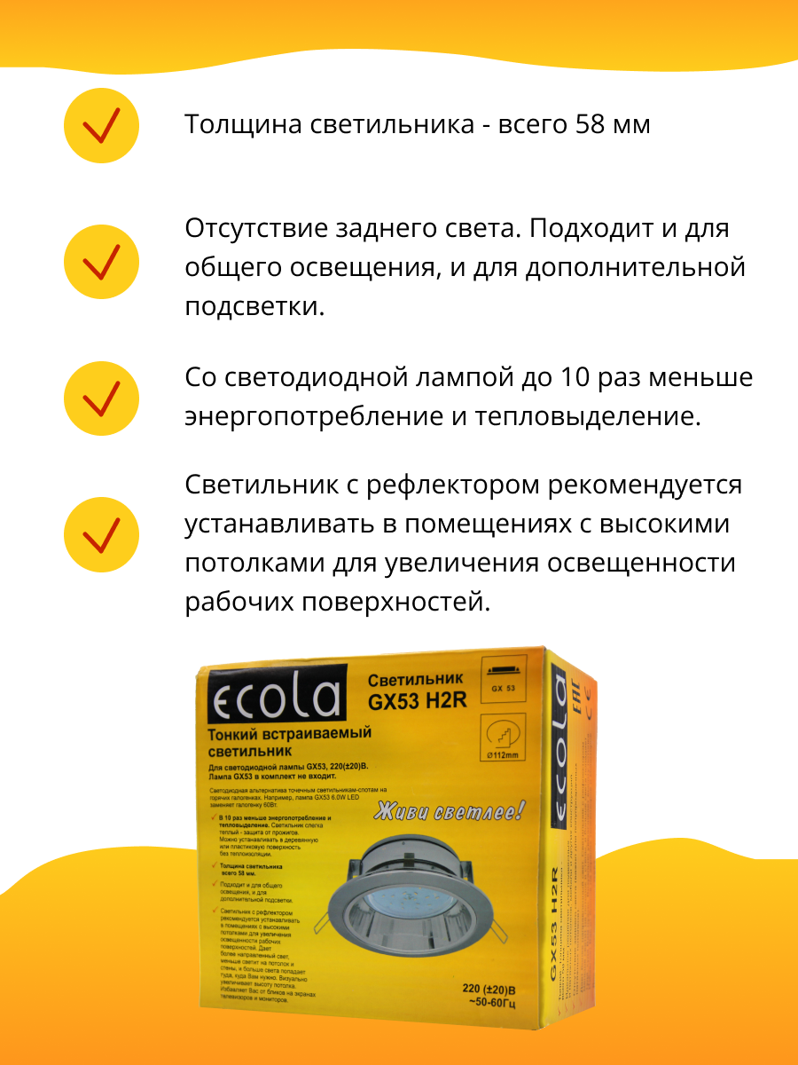 Отзывы на Светильник встраиваемый Ecola GX53-H2R с рефл. Хром 58x125 FC53H2ECB