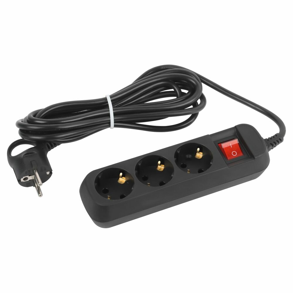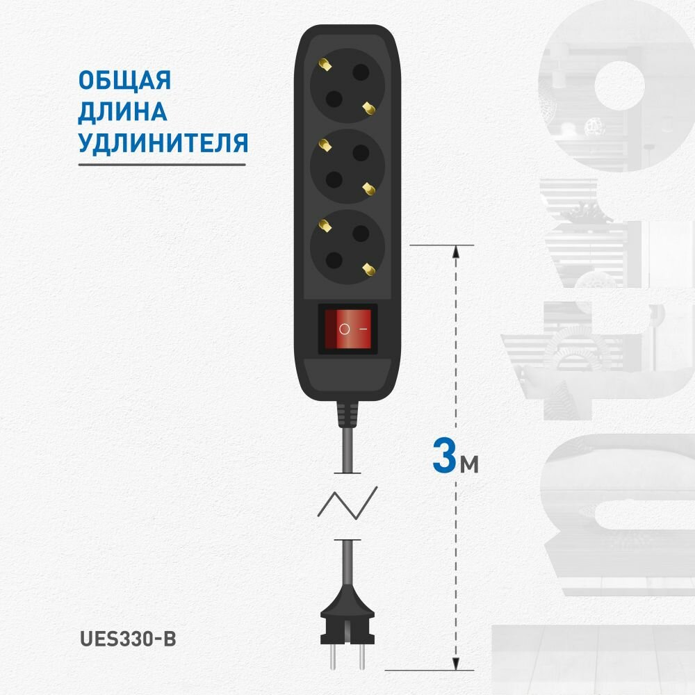Удлинитель Intro UES330-B сетевой электрический бытовой с заземлением с выключателем 3 розетки, 3 м, ПВС 3х0,75 мм2, 10А, черный