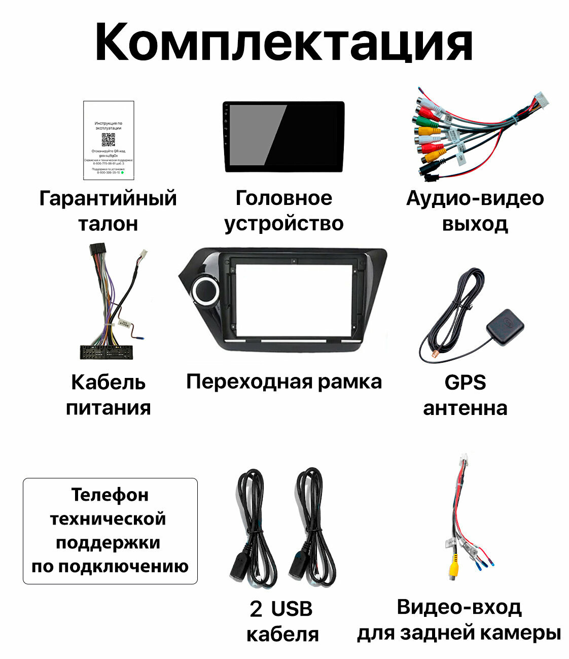 | Подробная комплектация | - Автомагнитола - Переходная рамка - Переходники для подключения к автомобилю- 4 линейных выходов + 1 выход сабвуфер - 2 тюльпана AUX - Тюльпан для камеры заднего вида - Тюльпан для камеры переднего вида - 2 USB- GPS антенна - Инструкция - Телефон поддержки по установке |
