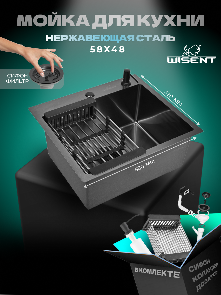 Врезная кухонная мойка 58 см, WISENT WS35848B с дозатором и коландером, матовое графит