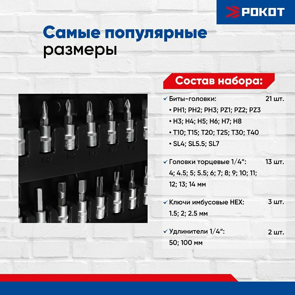 | Головки торцевые подробно | 1/4": 4, 4.5, 5, 5.5, 6, 7, 8, 9, 10, 11, 12, 13, 14 мм; со вставками 1/4": T10, T15, T20, T25, T30, T40, PH1-PH3, PZ1-PZ3, HEX3-HEX8, SL4, SL5.5, SL7 |