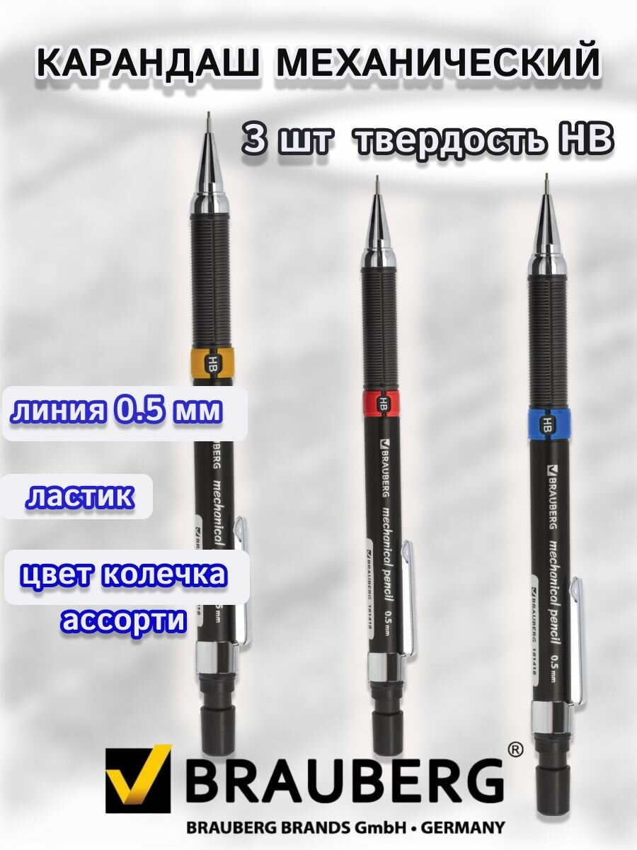 Карандаш простой BRAUBERG, механический, пластиковый корпус, ластик, грифель HB 0,5 мм, 3 штуки 529 ₽