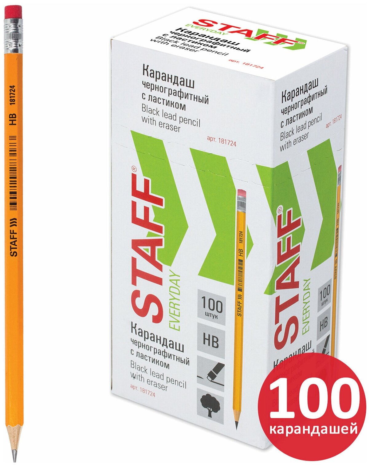 10 цен на Карандаш чернографитный с ластиком Staff Everyday Blp-724, Нв, Комплект 100 штук, корпус желтый, 880432