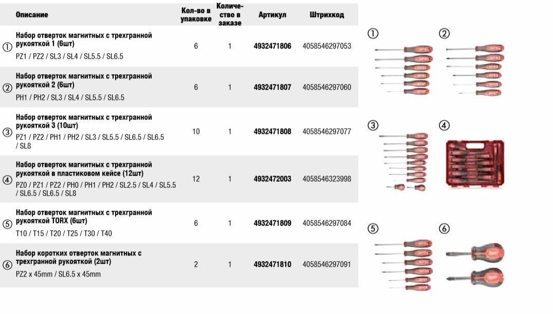| Отвертки подробно | 1 x PH 1 x 100 mm; 1 x PH 2 x 125 mm; SL x 0.5 x 3 x 75 mm; SL x 0.8 x 4 x 100 mm; SL x 1 x 5.5 x 125 mm; SL x 1.2 x 6.5 x 125 mm |