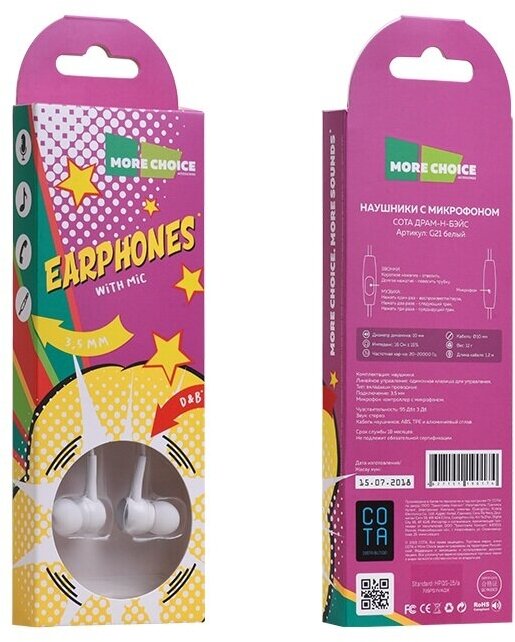 Наушники вакуумные для AUX разъема с микрофоном и регулятором громкости длина 1.2м More choice G21 White
