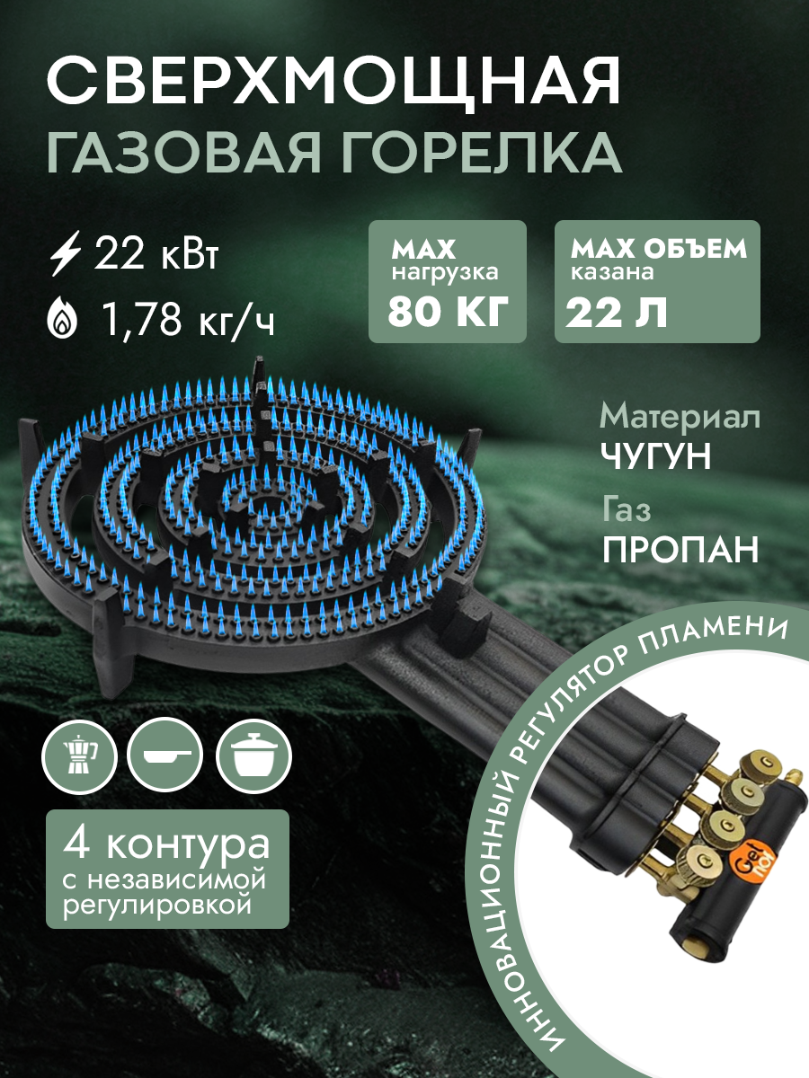 | Дополнительная информация | Подходит только под баллонный газ. Назначение: Встраиваемая / Для печи / Под подставку; расход топлива: 990 г/ч |