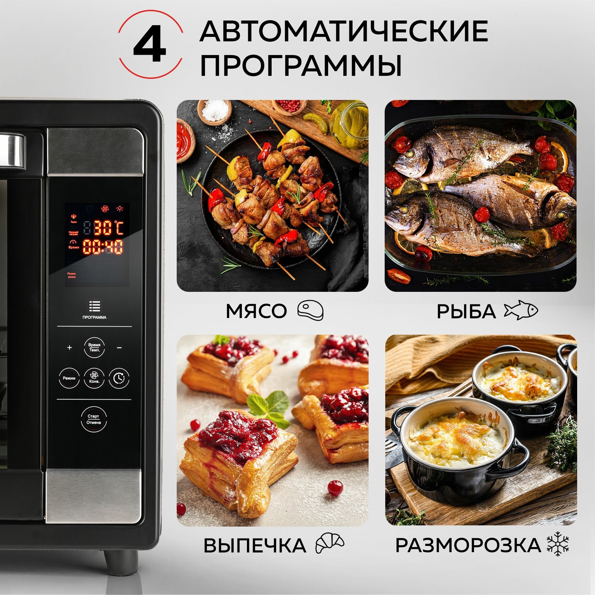 10 цен на GFGRIL Многофункциональная мини-печь GFOO-7, 63 л, 2200Вт, духовка с эл.управлением, конвекция, вертел, шашлычница