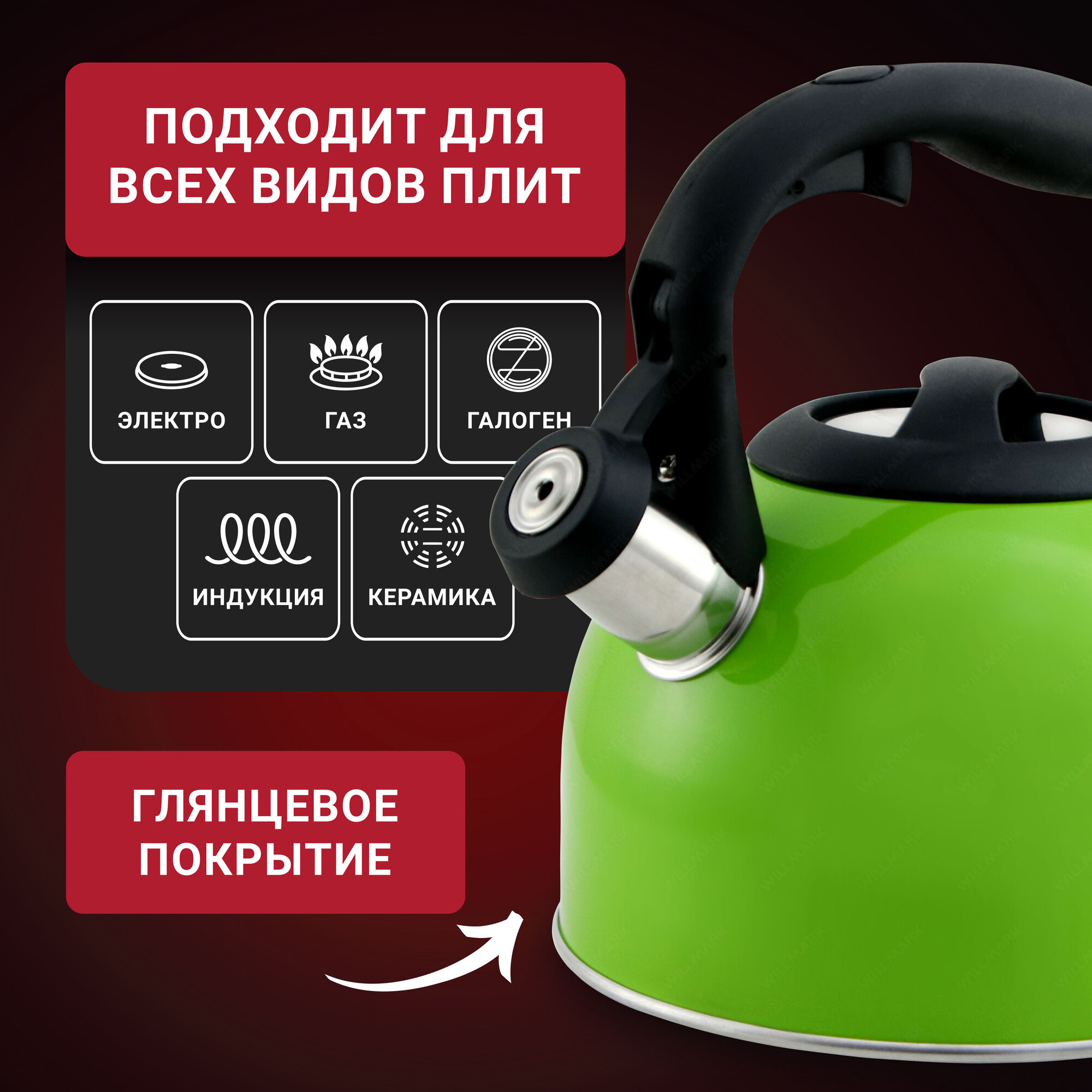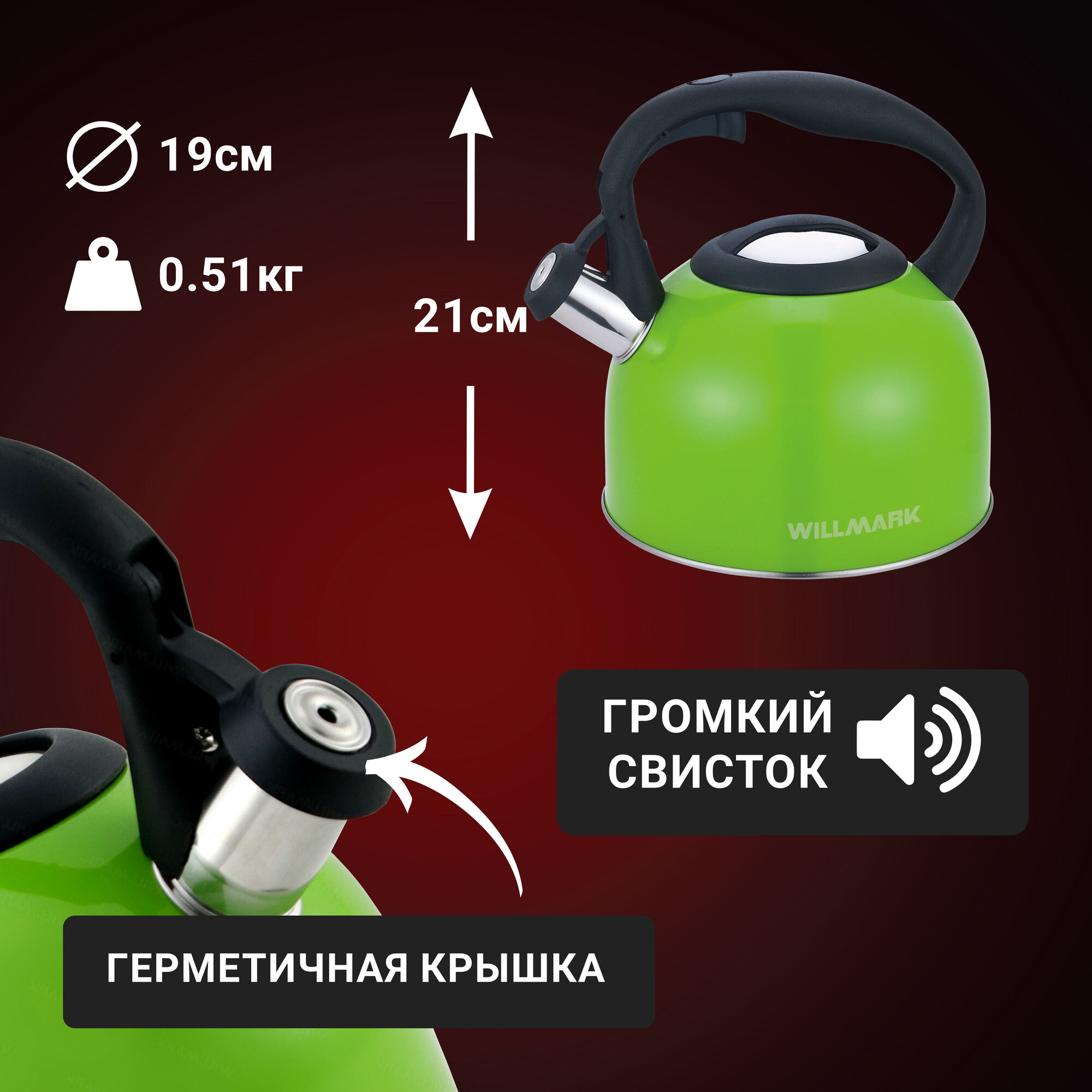 Чайник WILLMARK WTK-3229SS зеленый, со свистком, 2.5л, для плиты информация: