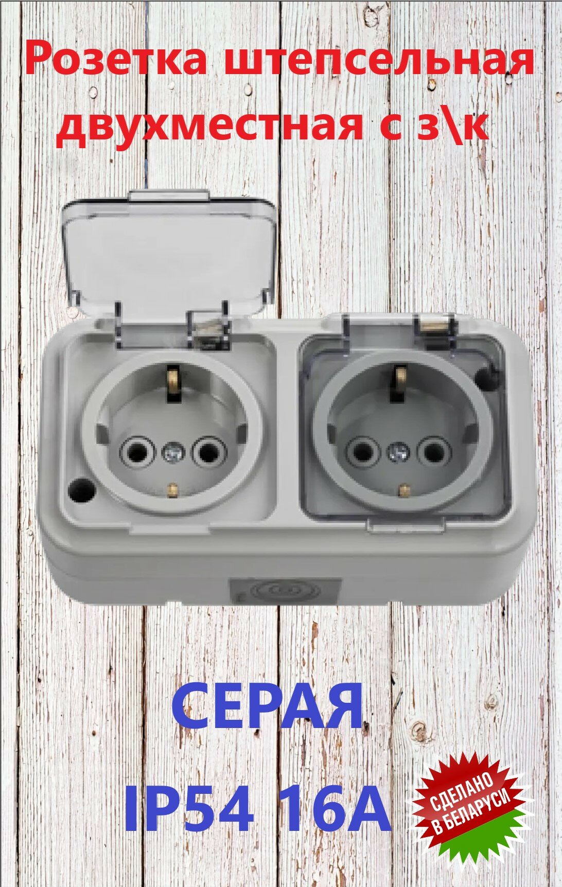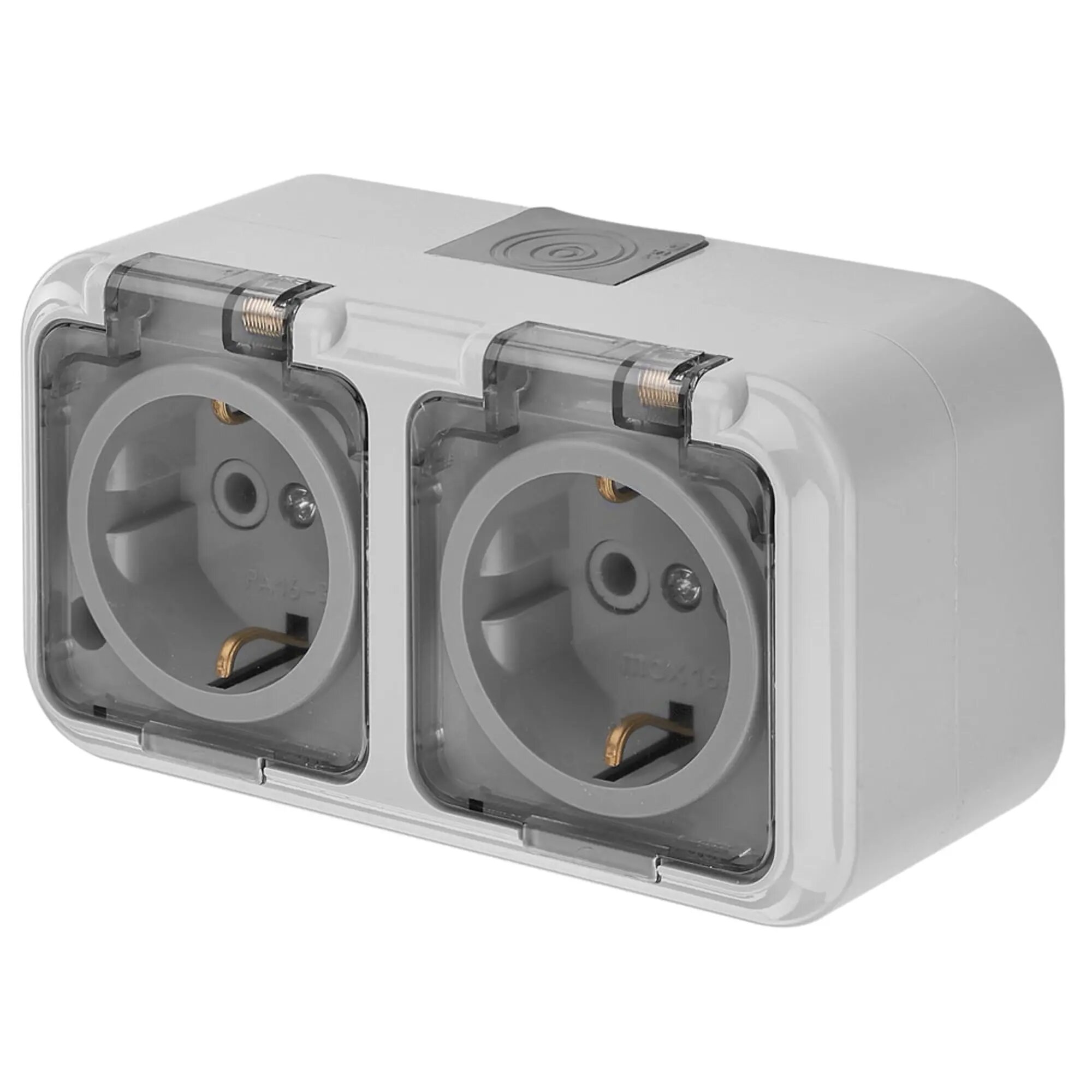 Розетка 2-местная с крышкой, влагозащищенная, открытой установки, с/з, IP54, серый/прозрачный