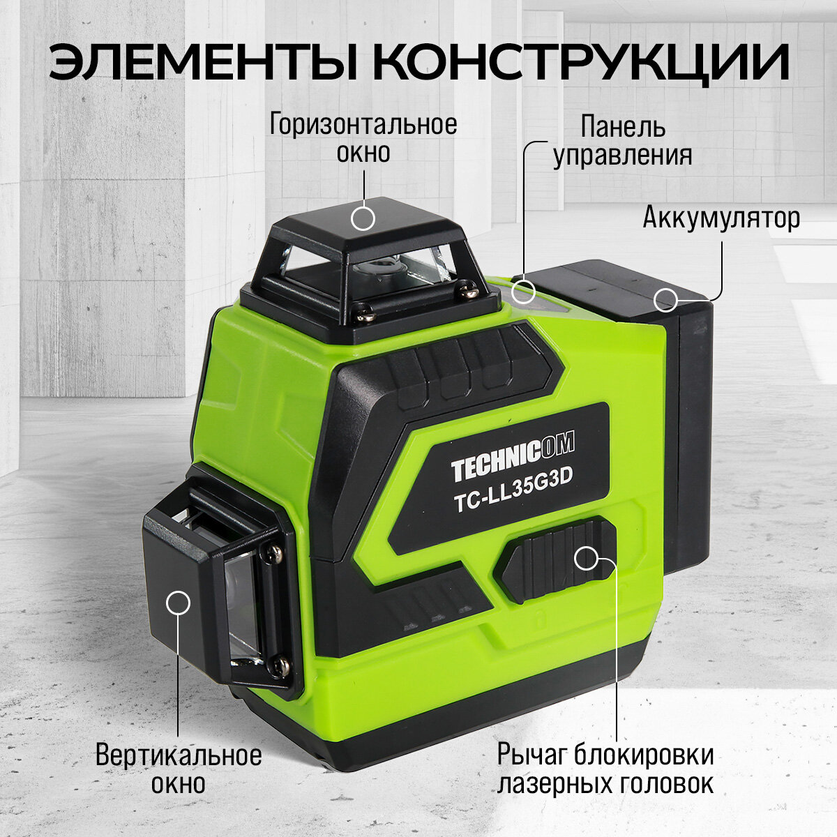 Лазерный 3D уровень TECHNICOM TC-LL35G3D, 12 лучей, дистанция 30м, 3 режима, 2 акб 2400мАч, цвет лазера зелёный информация: