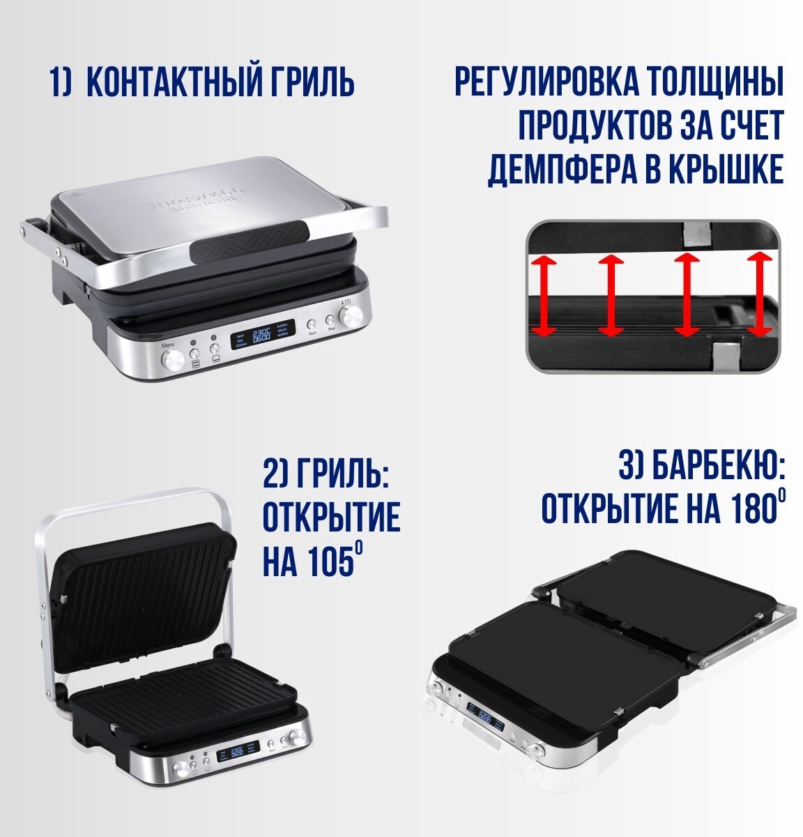 Гриль контактный 3 в 1 KENWELL, серый металлик информация: