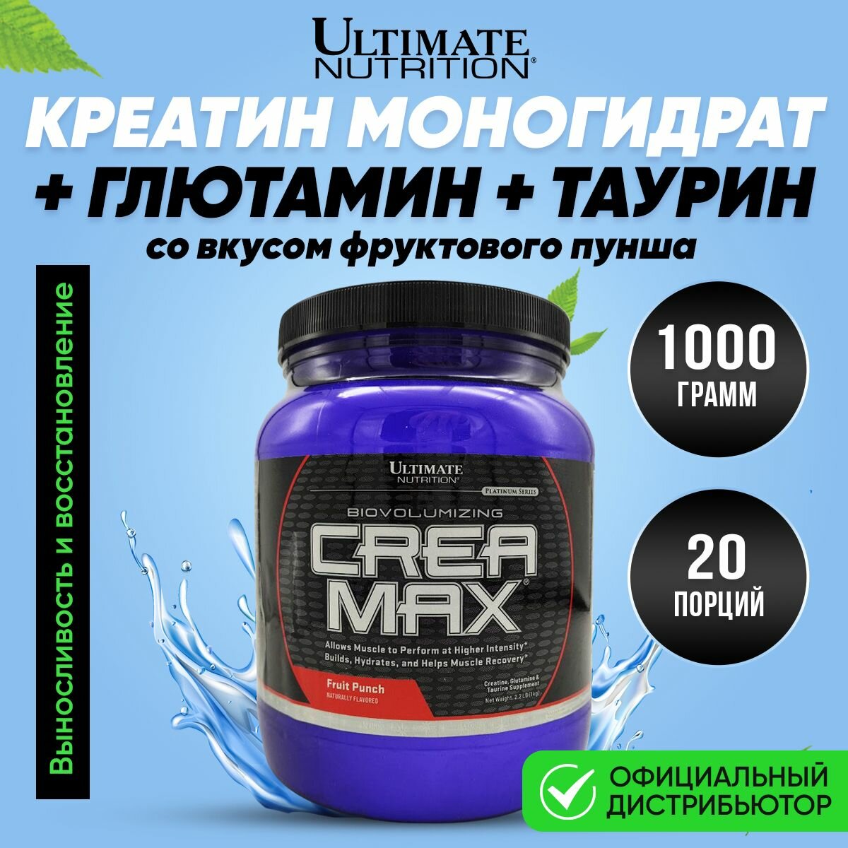 10 цен на Ultimate Nutrition Crea Max Powder, Креатин моногидрат с глютамином и таурином для выносливости и набора мышечной массы, порошок 1000 г со вкусом фруктового пунша