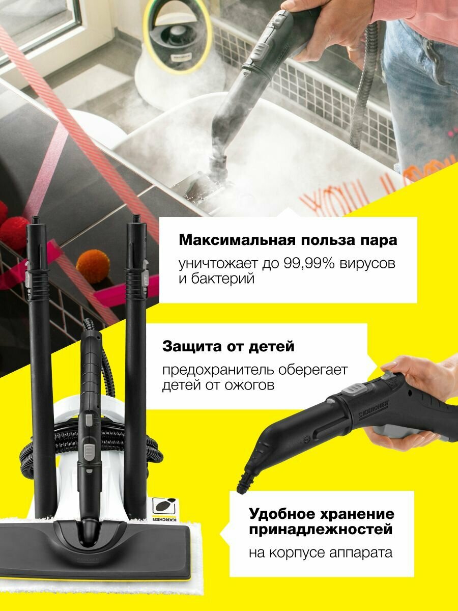 Пароочиститель Karcher SC 2 Deluxe *EU 1.513-400.0 для дома, 1500 Вт, 5 насадок, с двухступенчатым регулятором расхода пара на рукоятке, индикатор готовности, время нагрева 6,5 мин, белый информация: