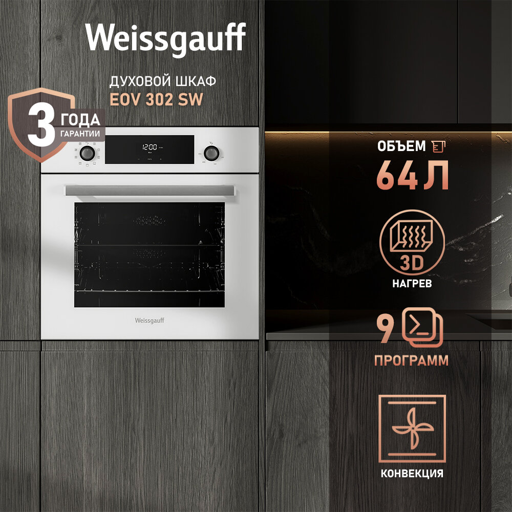 10 цен на Электрический духовой шкаф Weissgauff EOV 302 SW, 8 функций, конвекция, гриль, 60 см, объем XL 64 литра, доводчики дверей, 3 года гарантии