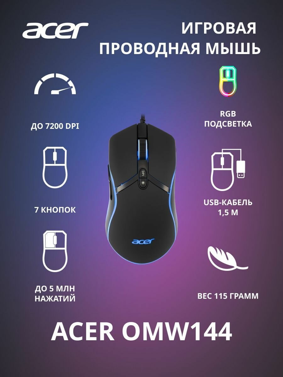 Мышь Acer OMW144, игровая, оптическая, проводная, USB, черный [zl.mceee.014]