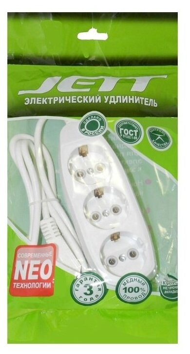 Сетевой удлинитель Джетт с заземлением 7м, 3 розетки, белый, россия