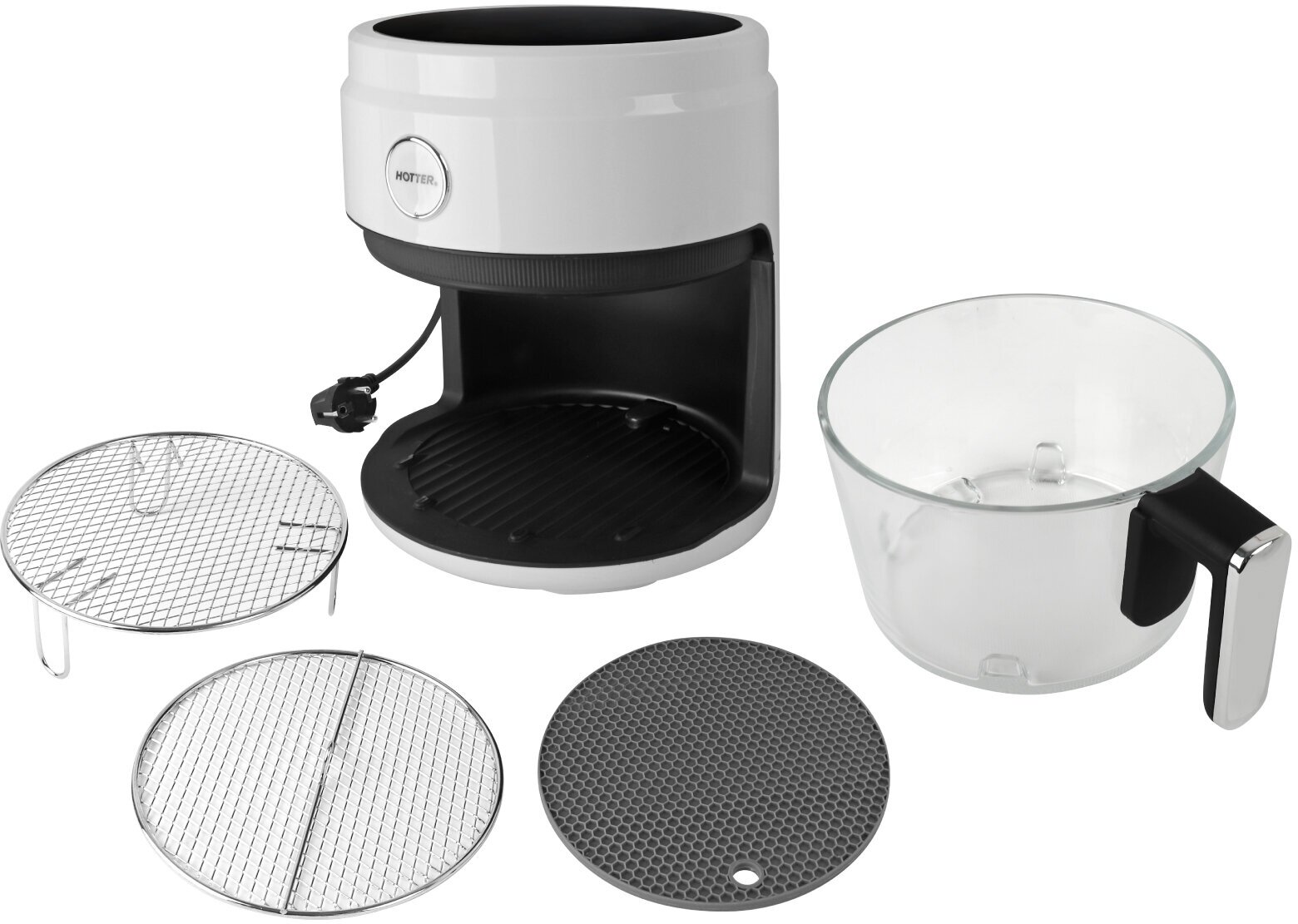Аэрогриль HOTTER HX-001, стеклянная чаша 3,5 л, 9 автопрограмм, регулировка времени и температуры, белый. информация: