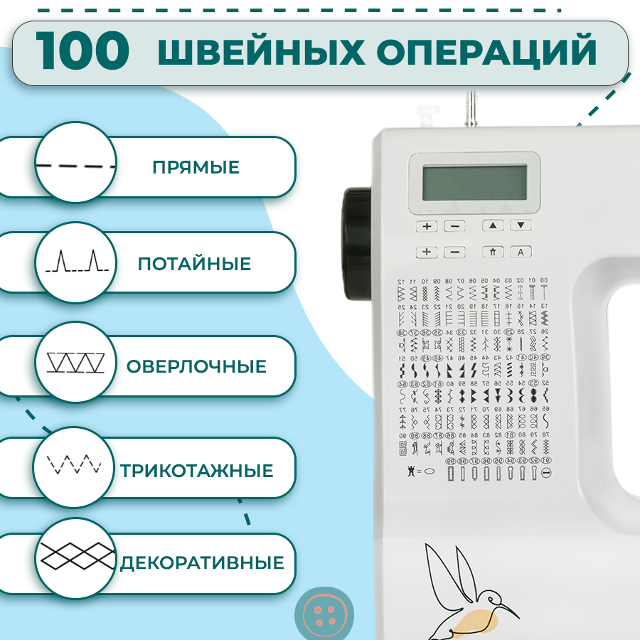 | Швейные операции | "глазки", декоративная строчка, обметочная строчка, потайная строчка, прямая строчка, строчка "зигзаг", эластичная потайная строчка, эластичная строчка |