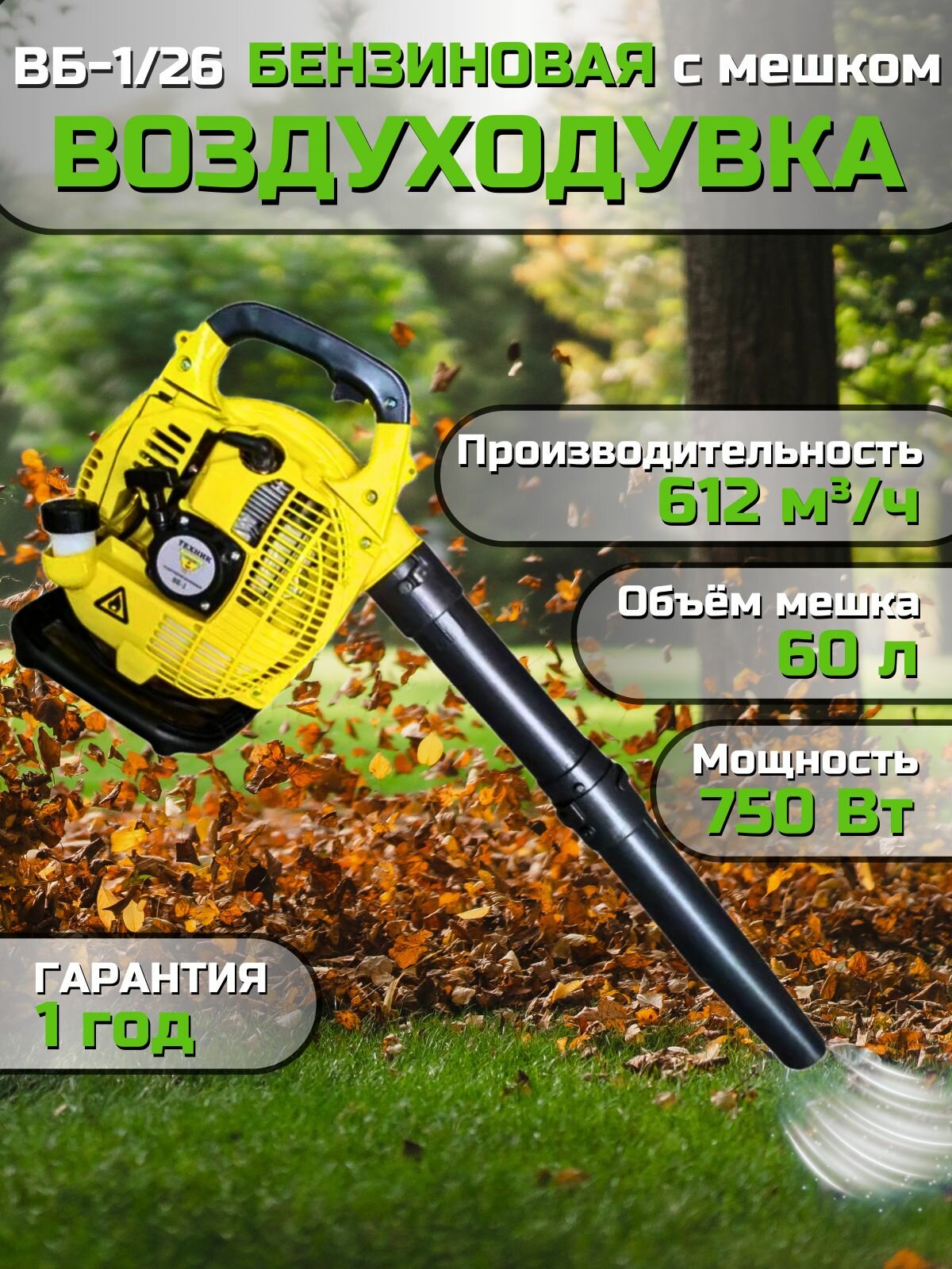 Воздуходувка бензиновая техник ВБ-1/26 с мешком / ветродуйка бензиновая 750 Вт информация: