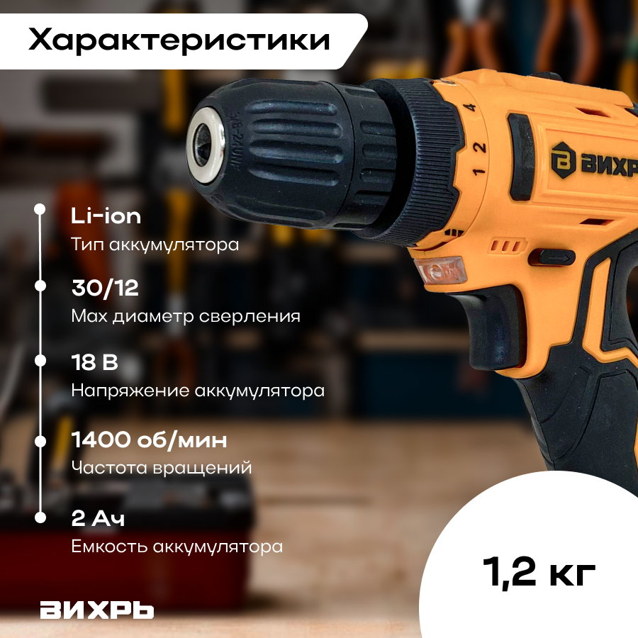 Дрель-шуруповерт аккумуляторная ДА-45/22Li-2 Вихрь, 18В, 1 акб и ЗУ, в коробке информация: