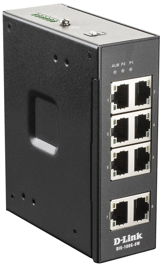 Коммутатор D-Link DIS-100G-8W Unmanaged Industrial Switch 8x1000Base-T, Surge 2KV, Alarm relay, DIN-Rail, metal case IP30, -40 to 75°C, only
