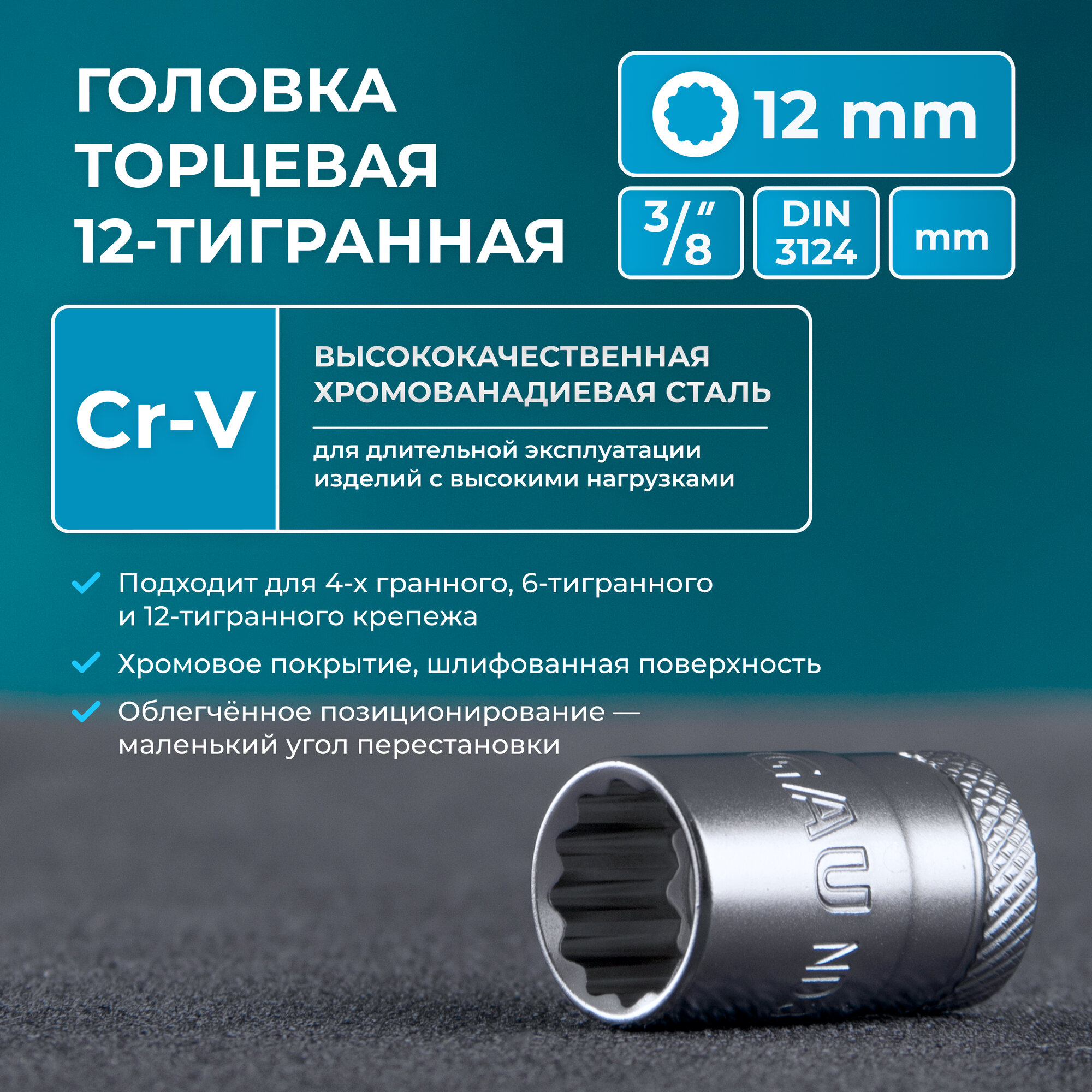 Головка на 12 NORGAU Industrial под квадрат 3/8" двенадцатигранная с шариковой фиксацией и шлифованной поверхностью, DIN 3124 информация: