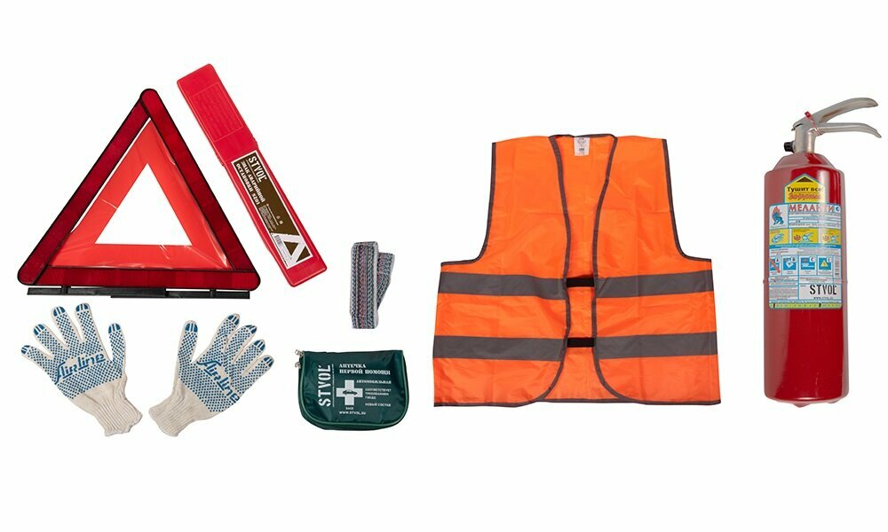 Наб.автомоб.Техосмотр-4/Знак+Аптечка+Огнетуш.ОП2+Жилет светоотражю+Трос+Перчатки STVOL SNA05 3 174 ₽