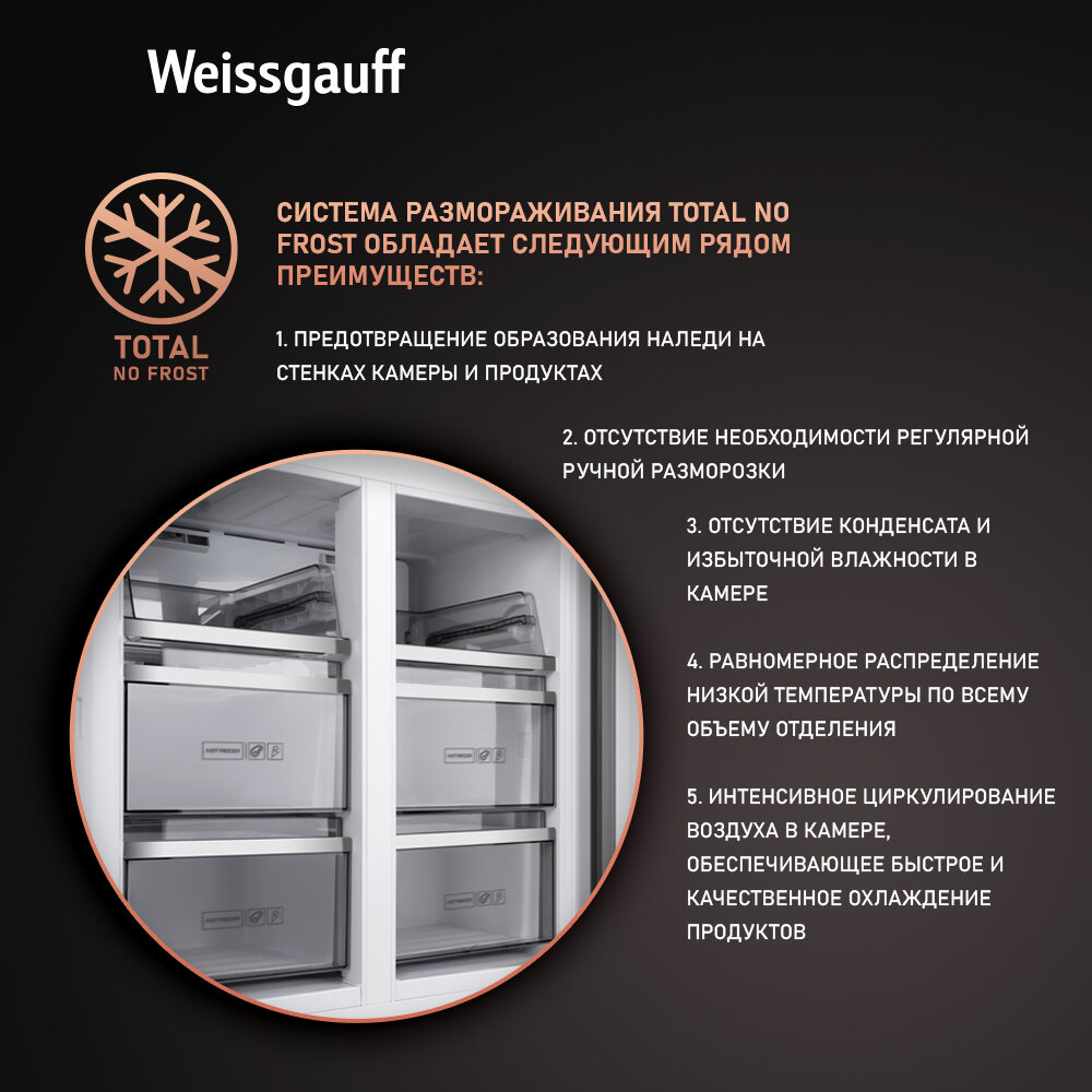 Отдельностоящий холодильник с инвертором Weissgauff WCD 590 Nofrost Inverter Premium Ecofresh Gold Glass 3 года гарантии, суперзаморозка, суперохлаждение, Инновационная система Metal-Tech Cooling 112 025 ₽