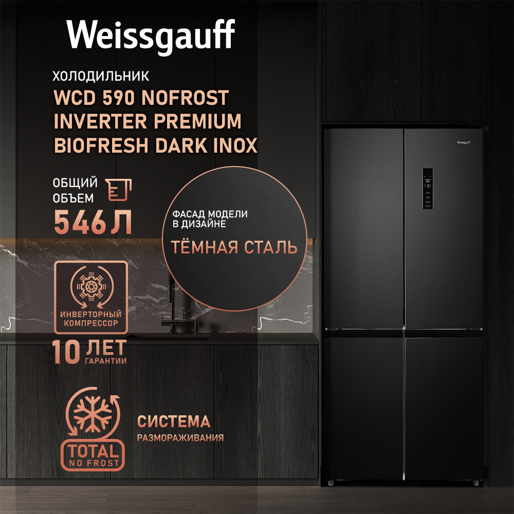 10 цен на Отдельностоящий холодильник с инвертором Weissgauff WCD 590 Nofrost Inverter Premium Ecofresh Dark Inox