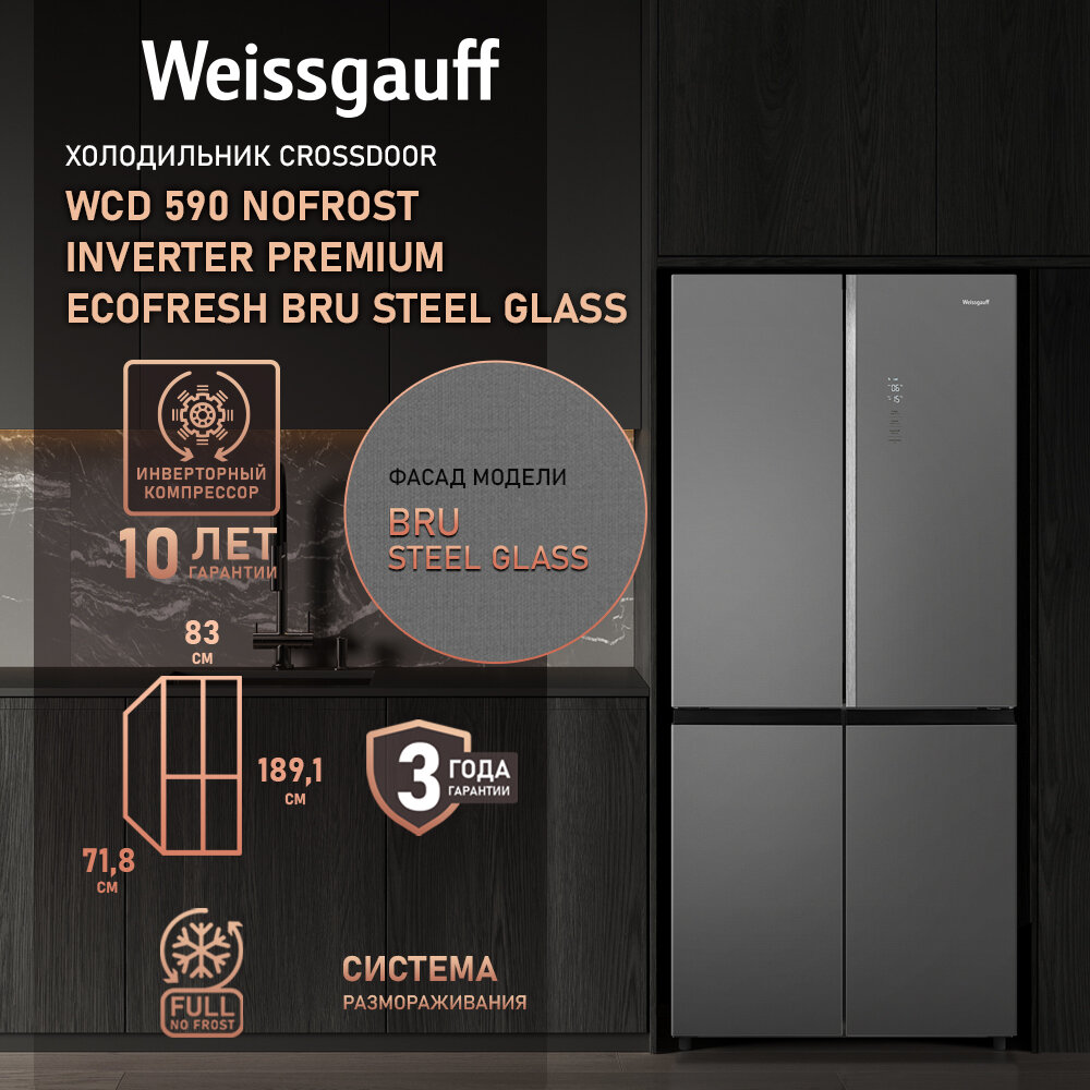 Отдельностоящий холодильник с инвертором Weissgauff WCD 590 Nofrost Inverter Premium Ecofresh Dark Grey Glass 3 года гарантии, CrossDoor, суперзаморозка, суперохлаждение, технология Multi Air Flow и Metal-Tech Cooling, LED-освещение 112 025 ₽