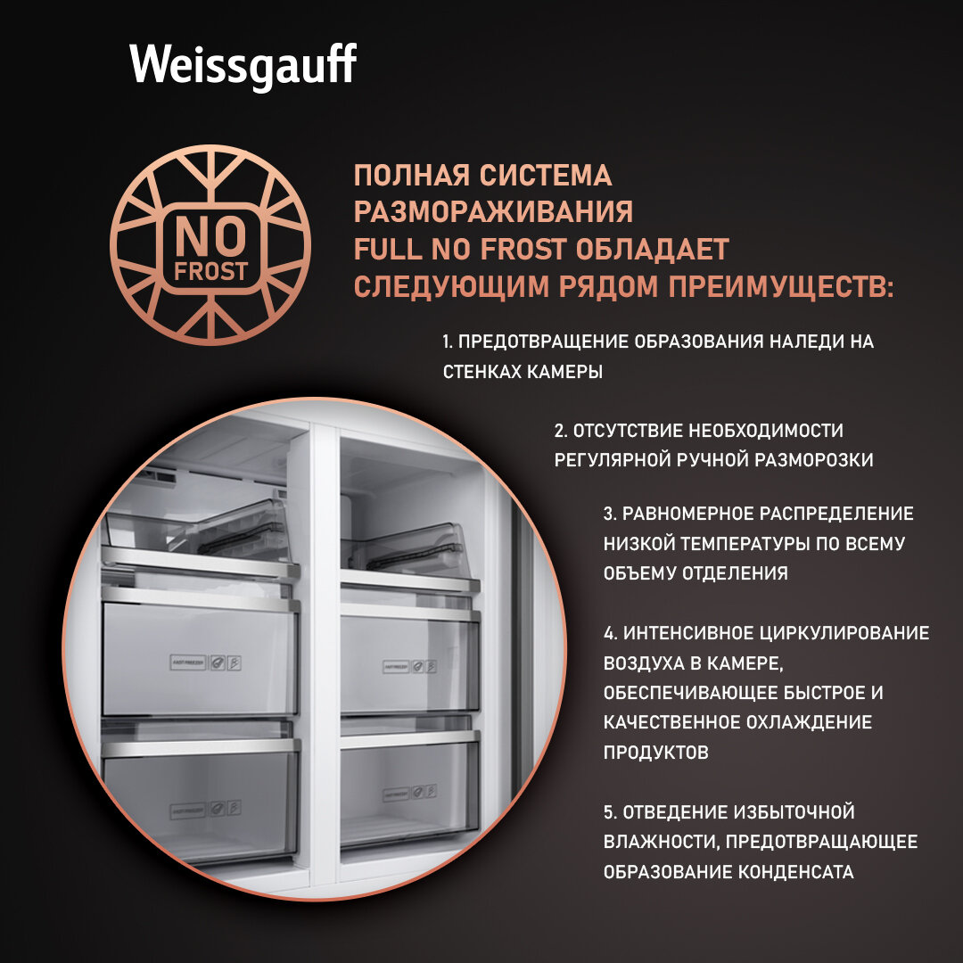 Отдельностоящий холодильник с инвертором Weissgauff WCD 590 Nofrost Inverter Premium Ecofresh Gold Glass 3 года гарантии, суперзаморозка, суперохлаждение, Инновационная система Metal-Tech Cooling 112 025 ₽