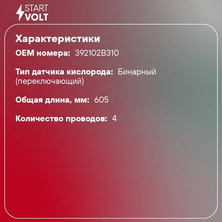 Датчик кислорода (лямбда-зонд) Hyundai Creta (16-) 1.6i/Solaris (10-) 1.4i/1.6i до кат. (STARTVOLT) информация: