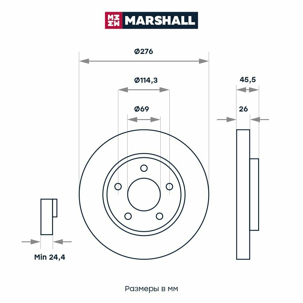 Диск тормозной передний Marshall M2000444 для а/м Dodge Caliber, Mitsubishi Lancer VIII, X 276х26 мм. информация: