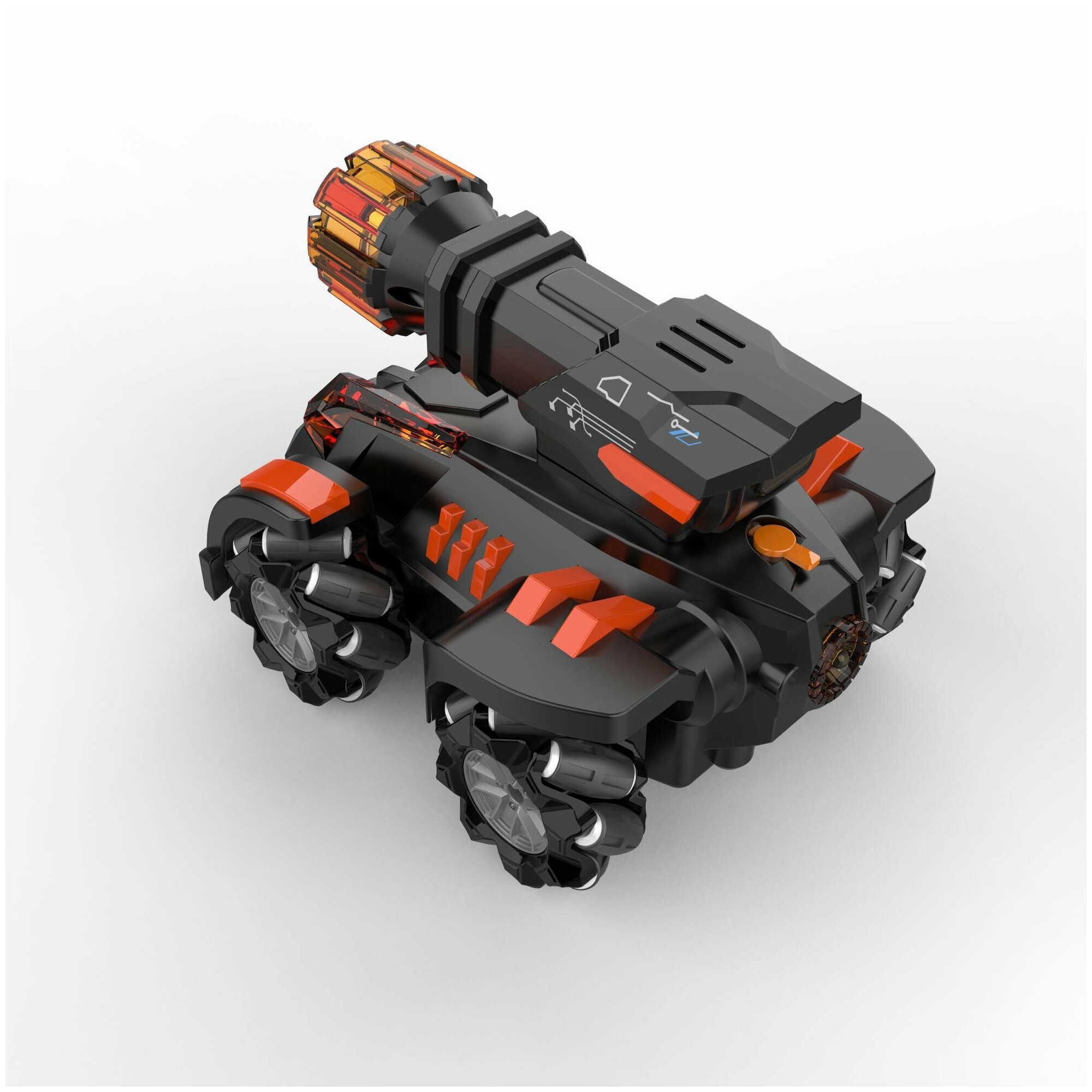 | Дополнительная информация | генератор пара, оснащены инфракрасной пушкой, всенаправленные-роликовые колёса Mecanum, у модели «три жизни», короткое нажатие на кнопку «огонь» – обычный выстрел, забирает одну «жизнь», длинное нажатие (2-3сек) на кнопку «огонь» - сильный выстрел, сразу поражает противника, при стрельбе имитируется звук выстрела и откат, вращение на 360 градусов, башки поворачиваются на 160° |