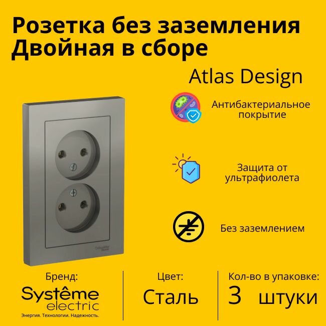 Розетка электрическая двухместная Systeme Electric Atlas Design без заземления в сборе 16А, Сталь ATN000920 - 3 шт. информация:
