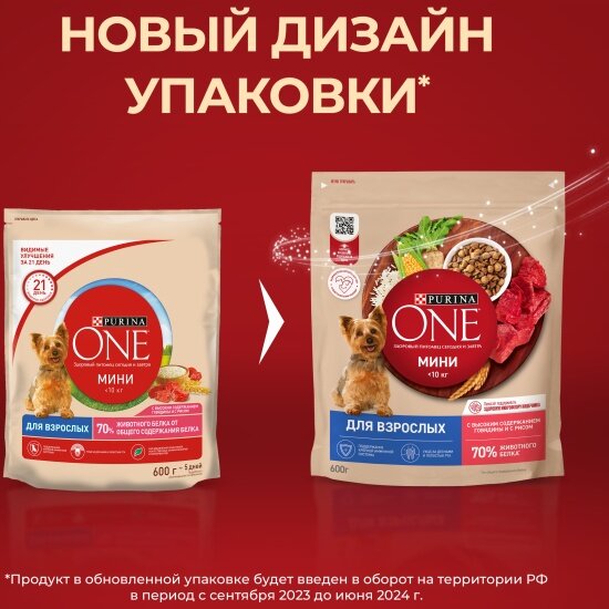 Сухой корм Purina ONE мини Взрослая для собак мелких пород, с говядиной и рисом, 600 г, 4 шт
